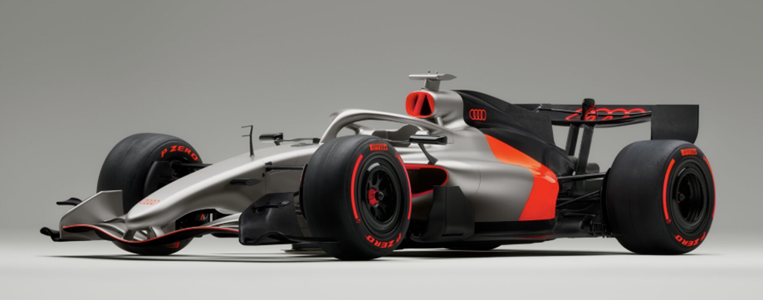 アウディは11月12日、ミュンヘンで開催したブランドイベント「Audi One」で、2026年のF1参戦に向けた新ビジュアルアイデンティティと「R26コンセプト」を公開した。R26は実戦マシンそのものではなく、カラーリングと造形言語を示す“予告編”であり、シルバー(チタニウム)とアウディレッド、カーボンブラックを基調にした幾何学的デザインが特徴だ。デザイン哲学は「明快・テクニカル・インテリジェント・エモーショナル」の四原則に基づくという。