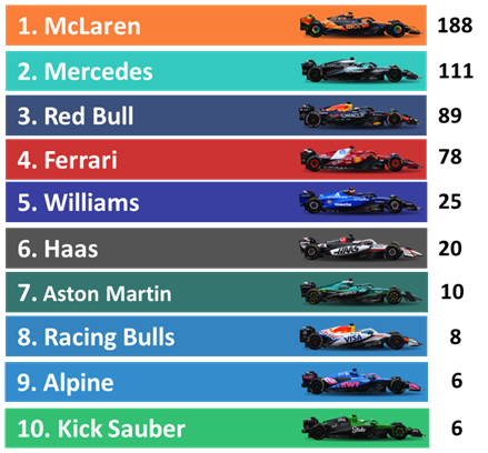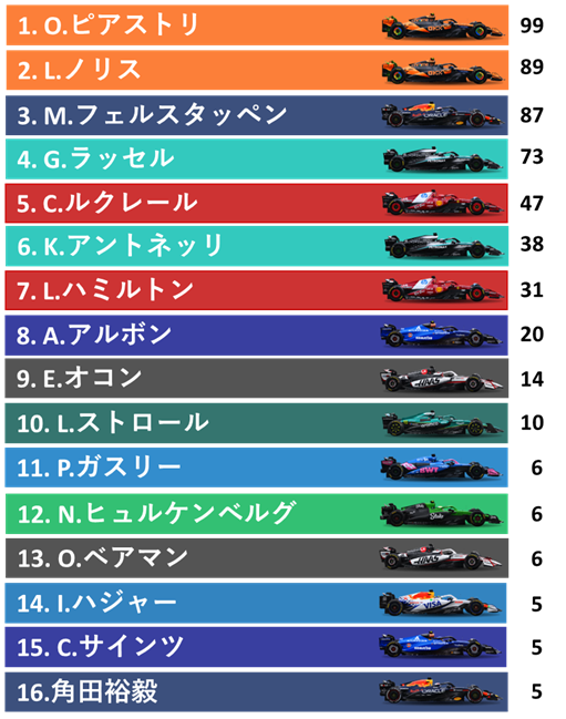 2025年F1チャンピオンシップポイント(第5戦サウジアラビアGP終了時点)