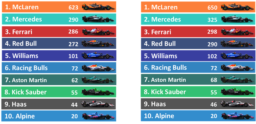 シンガポールGPの結果を受けて、McLaren が2025年のコンストラクターズ・チャンピオンを決定した。 2位には Mercedes が 325ポイント、Ferrari、Red Bullが続く。2位以下を巡る激しい争いが続く見込み。