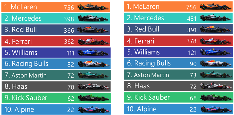 2025年ラスベガスGP後のドライバーズ選手権は残り2戦、タイトル争いが佳境に入った。マクラーレンのノリスとピアストリは失格で大量ポイントを失ったため、フェルスタッペンはついにピアストリに追いついた。ノリスとの「24ポイント」差は1戦で逆転可能であり、シーズン中に100ポイント以上の差を克服した歴史的な挽回劇となっている。明らかにマクラーレンはシーズン前半の優位性を失っている。この状況でのラスベガスでの失格は、今季最大の痛手であり、ノリスは依然有利だが選手権の流れはフェルスタッペンに傾いた。