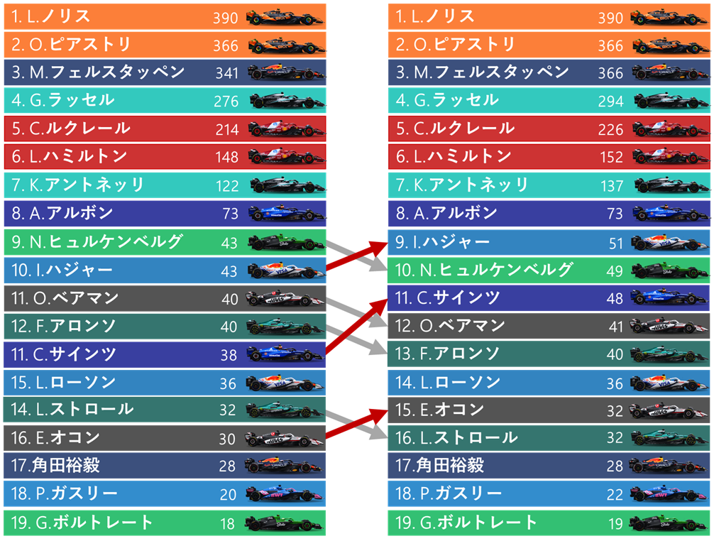 3位レッドブルはフェルスタッペンが加算を続けているが、2位メルセデスの大量得点でその差は32点から40点に広がった。4位フェラーリは中位争いの混乱を突ききれず伸び悩み、3位レッドブルとの差は4点差から13点差に広がったが、まだ射程内だろう。中団ではウィリアムズが5位の座を固め、名門復活の波に乗りつつある。その後ろではレーシングブルズ、アストンマーティン、ハース、ザウバーが僅差で争いを継続しており最終戦まで接戦となる見通しだ。