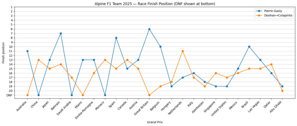 ハイライトはバーレーン7位、雨の波乱があったイギリスで6位、ガスリーが22点を稼いだがコンストラクターズ選手権では最下位に沈んだ。中国GPの重量不足による失格に象徴されるミス、リタイアの多さ、開発停止で伸び代を失った現実が、一年を食い潰した。チームは早期に2026年に向けた開発に注力しており、また長らくF1を席巻してきた「ルノーエンジン」を捨て、メルセデスPUにスイッチした効果に期待している。