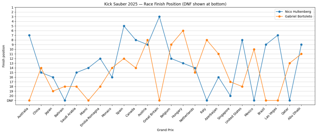 ドライバーは経験と将来への投資の二段構えとなった。ニコ・ヒュルケンベルグが51点を稼ぎ、イギリスでは19番手から3位にねじ込んで初表彰台を獲得。スペイン5位、開幕オーストラリア7位、ラスベガス7位など、要所で確実に点を拾った。一方のルーキー、ガブリエル・ボルトレートは19点。ハンガリー6位が最大で、オーストリア8位、イタリア8位、ベルギー9位、メキシコ10位と散発的に入賞したが、DNFも多く学習コストは高かった。