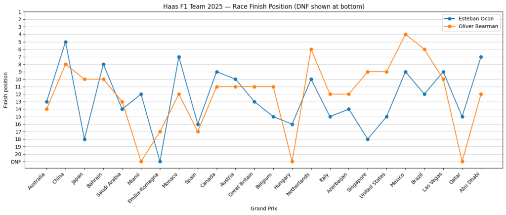 ハースの2025年は「得点は伸びたが順位は落ちた」シーズンだった。コンストラクターズは79点で8位。勝利も表彰台もないが、トップ10入りは18回、スプリントでも6点を積み、DNFは4回に抑えた。予選では波も大きかった。2024年の58点・7位から点は増えた一方、ミッドフィールドの密度が上がり、数字の伸びほど序列は上がらない現実を突きつけられた。2024年はヒュルケンベルグ/マグヌッセンで“堅実に拾う”復調路線だったが、2025年はオコン+ルーキーのベアマンへ刷新。得点はベアマン41、オコン38と僅差で、後半はベアマンが上昇傾向を見せ、オコンが要所で支える結果になった。