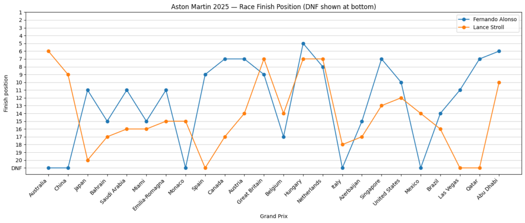 戦績のハイライトは分散し、マシンのセッティングが決まるサーキットで相対パフォーマンスが急に伸びる。ストロールは開幕オーストラリア6位、イギリス7位が頂点で、アロンソはハンガリー5位、カナダ/オーストリア/シンガポール/カタールで7位、最終戦アブダビ6位などで拾い続け、89点のうち56点を稼いだ。