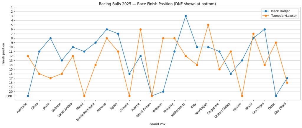ハイライトは複数ある。モナコはダブル入賞で中団勢としての最大効率を示し、バクーではローソンが5位で決定打を打った。ハジャーは日本GP8位で初ポイントを記録し、夏場のオランダGPでは3位表彰台まで到達し、チームにとっても象徴的な成果となった。