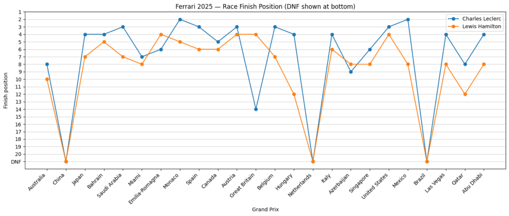 ハイライトは、ルクレールのサウジアラビア3位、モナコ2位、アメリカ3位、メキシコ2位だった。一方で中国GPの両車失格は、タイトル以前に基本品質で落とした点として象徴的だ。