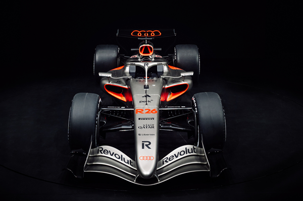 R26のベースカラーを先に公開していたアウディは、ベルリンでの特別ローンチイベントにて2026年F1マシンの正式リバリーを披露した。最終デザインはメタリックグレーを軸にブラックを織り込み、蛍光レッドを差し色として加え、象徴的なロゴが映える仕上がりだった。
